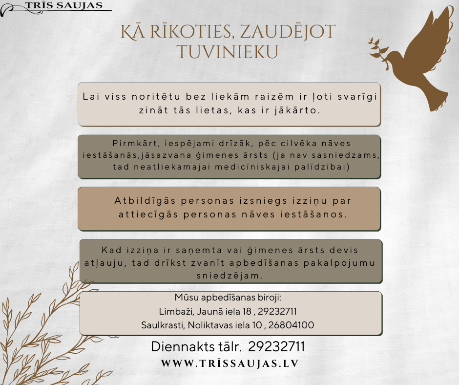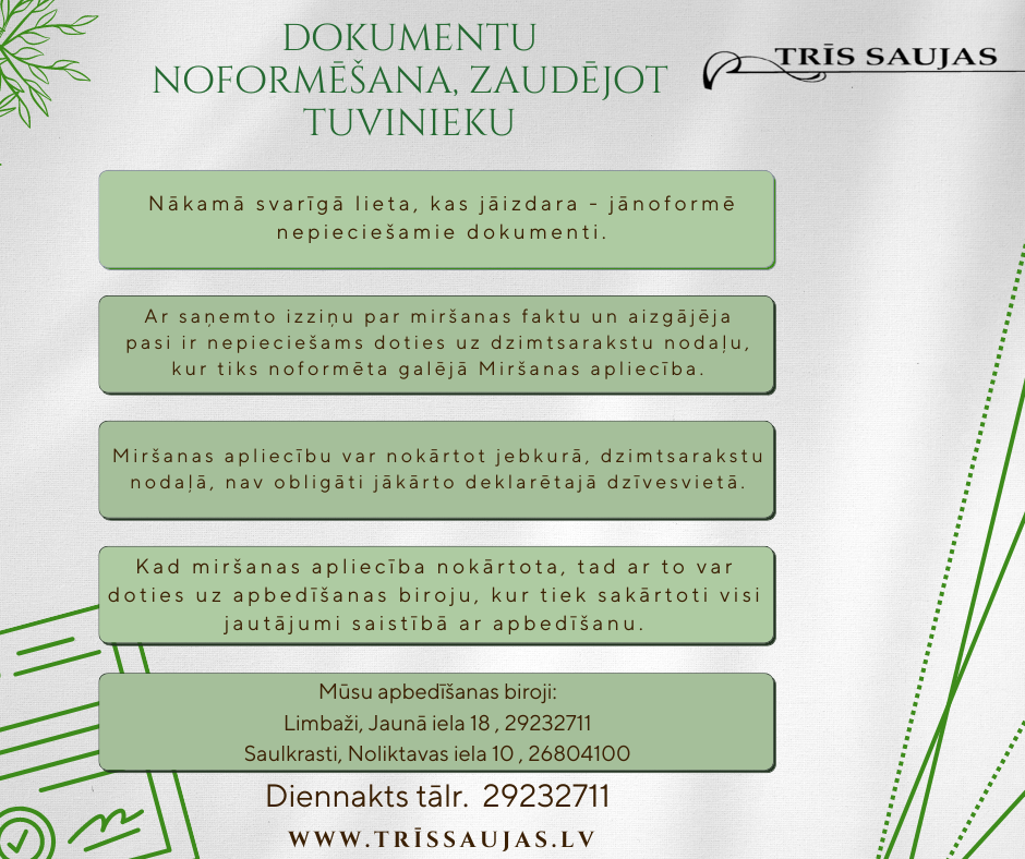 Lasīt vairākPalīdzēsim Jums atrisināt visus svarīgos jautājumus saistībā ar tuvinieka aiziešanu, bēru organizēšanu un kremāciju. Pie mums varēsiet arī izvēlēties visus nepieciešamos apbedīšanas piederumus.